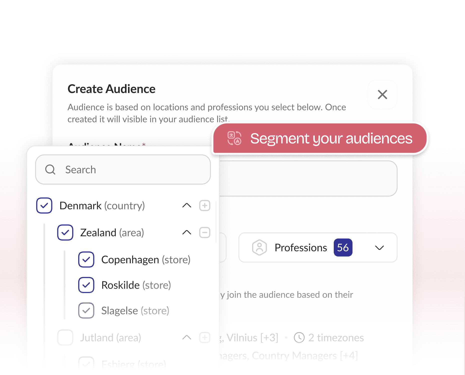 Segment your audiences by profession and location, so you can easily distribute the right information to the right people.